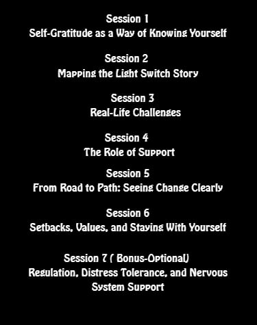 This is not therapy and not a quick-fix program. It is a guided, applied learning experience designed to help you understand why change has felt difficult, and how to work with yourself in ways that actually support progress.
